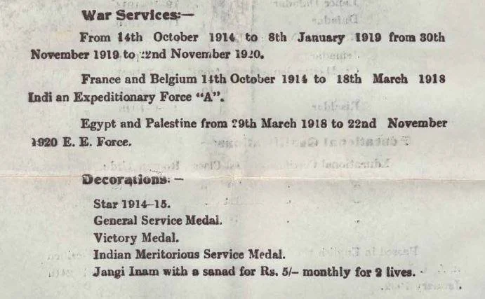 He was awarded the Indian Meritorious Service Medal for services in France.